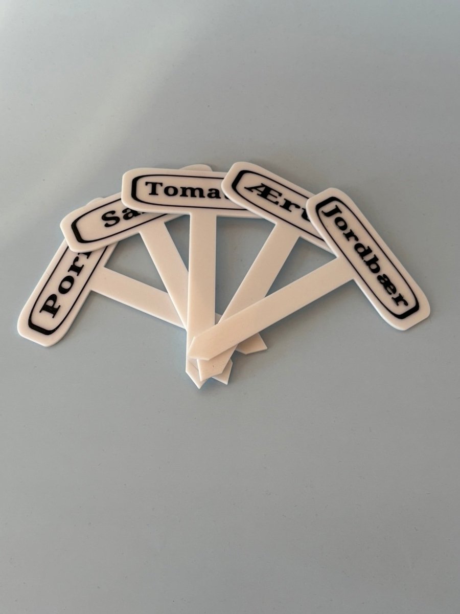 Planteskiltene har tydelig sort skrift på hvid baggrund, så de er lette at læse – også på afstand. De måler ca. 140 mm i højden og 100 mm i bredden, hvilket gør dem store nok til at være synlige, men stadig diskrete i bedet. Der er over 30 forskellige skilte at vælge imellem, så du kan finde dem, der passer til netop din have og dine afgrøder.