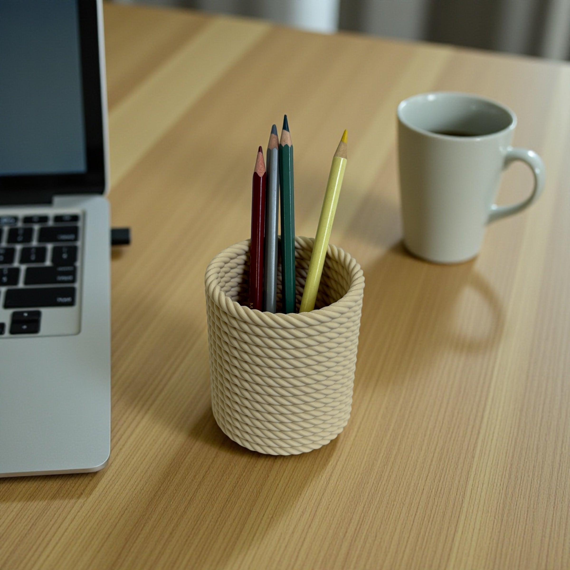 Skab orden på skrivebordet med en blyantholder, der kombinerer funktion og design. Denne model har et struktureret reb-look og er 3D-printet med høj præcision for et ensartet og stilrent resultat.